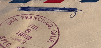 I don’t think it is your fault that the Specials haven’t been getting here on Sundays. This is one was postmarked Friday, July 9 at 8:30 and it was received in San Francisco Monday, July 12 at 12 PM, so you see, the plane must have gotten a flat tire or ran out of gas on the way.