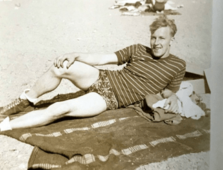 I’m getting awfully tired of working now. I should be with you or rather you with me. I sure wish you were going with John and I up to the Russian River Sunday. That is where Syd and I went last year. I sent you some pictures of me in a swimming suit that you said ought to fit Timmy.