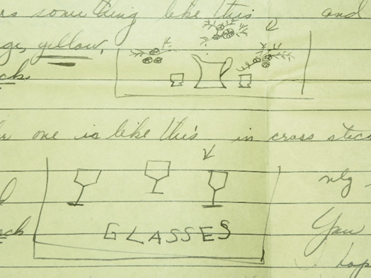 I received a letter today just before I left for town. I will answer your questions first of all. I’m sorry about you cutting your finger. I remember the night I cut your forehead with my fingernail. I also remember a lot of other nights too. What are you embroidering on the towels? I think it’s very good idea.