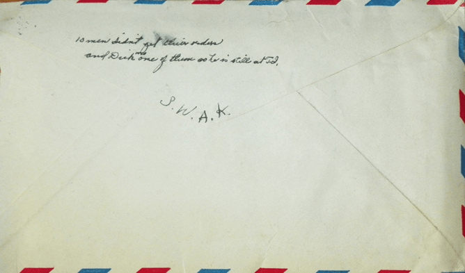 In your letter of the 7th, you wrote “Have you any news for me yet?” You know what I mean. Have you told your folks about thinking about staying out here? What do you mean “You know what I mean”. I don’t know what you mean, unless if it about asking dad about me staying. If that’s the case, I told you about that in my letter yesterday but if that isn’t what you meant, then please tell me what it was. O.K? O.K.