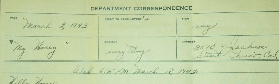 I have your Special to answer and the letter that came Saturday. No, I won’t tell Opal that you were coming out and I haven’t told the folks that you are coming out. As far as the folks coming out, I can’t say. I was up to the country today and they say they kept writing Dad and want him to come out. I hope they don’t come to Frisco though. You know as well as I do what it would mean.