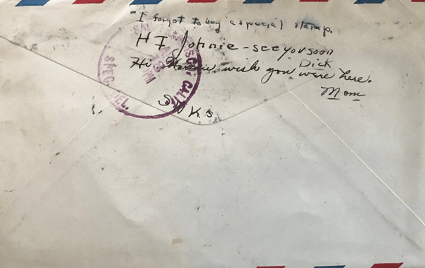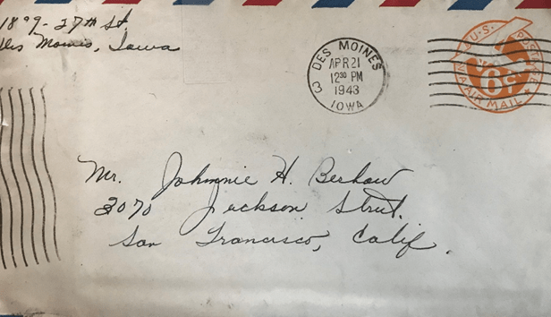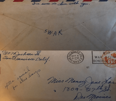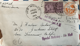 Special: Harlan and Janie often speak of “Specials”. These were letters mailed “Special Delivery” and typically would travel from Des Moines Iowa to San Francisco Ca and visa-versa in 1-2 days It was a postal service paid for with additional postage for urgent letters and postal packets which are delivered in less time than by standard or first class mail service. Essentially it meant that a letter or a postal packet was delivered from a post office to the addressee immediately once it arrived at the post office responsible for delivering it, rather than waiting for the next regular delivery to the addressee.)