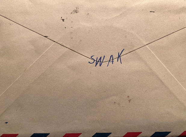 Oh yes, I bought seven airmail stamps and two Special delivery stamps, and the fellow said, “You must write a lot”, and I said, “It’s a week’s supply”, and he said and “Two specials?” I said, “That’s right”’ he said, “That is either love or hate”, and I said, “the former” and he laughed!
