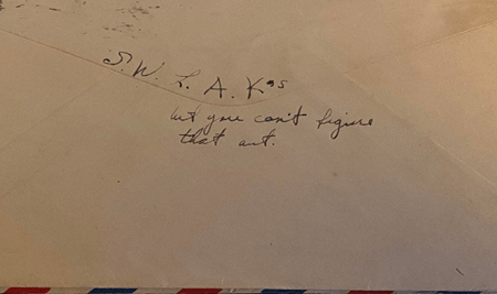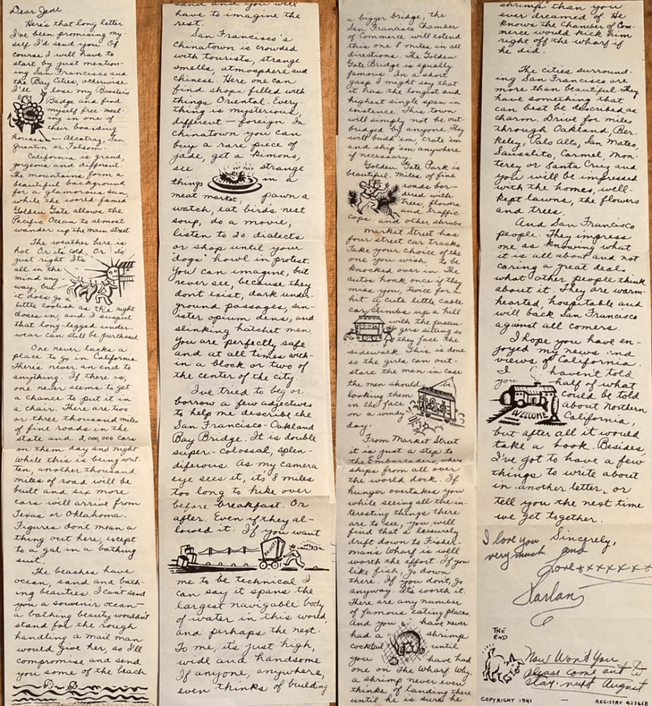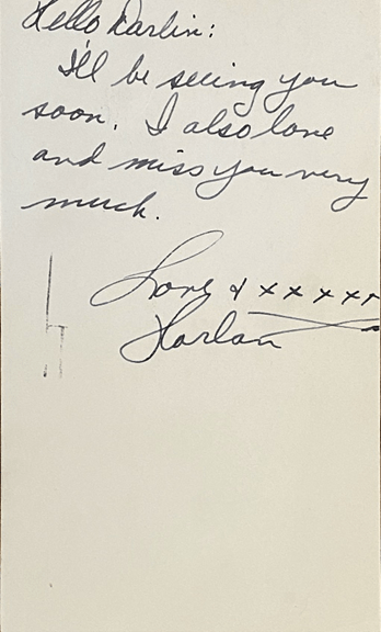 Oh shoot, I wish I could write what I think. I guess all I can say is that – – I love you Harlan and miss you terribly and am living for the day we are together for always. Till death do us part. – – Those words aren’t as pretty as a poet could do it but it’s dreaming that counts and you know I mean and live in those words as much as I do in my own life.