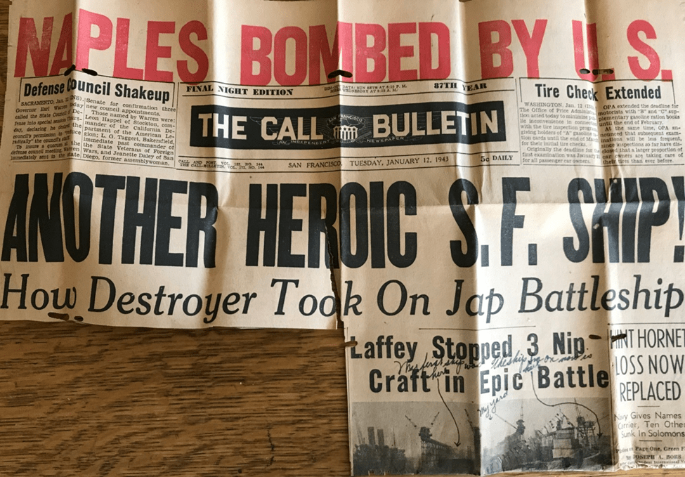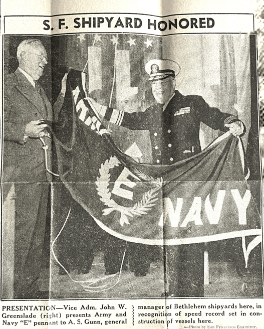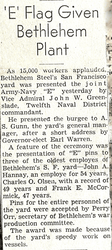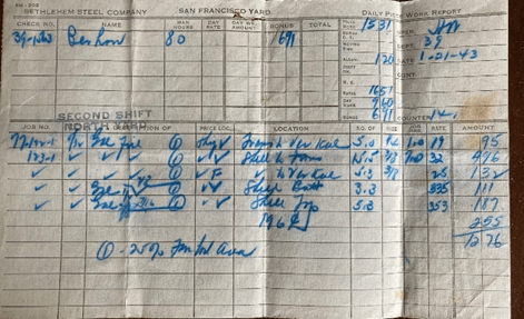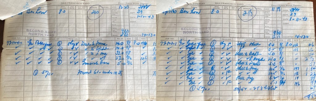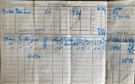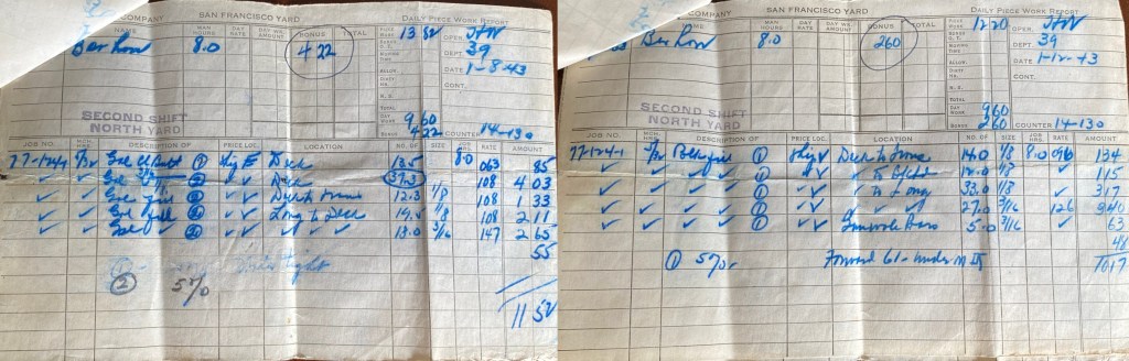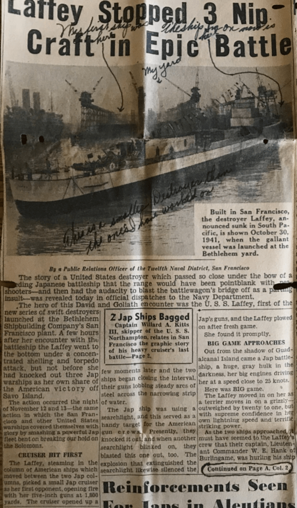 We have sure had a lot of excitement in the yard last night and tonight. A wife of a fellow who works for Bethlehem got a telephone message the other day. The fellow who called started to talk in German. The lady said she couldn’t understand it because she was an American. Then the fellow started speaking English. He told her that her husband was supposed to blow up the next ships to be launched. (That is my ship.) He said her husband had $10,000 of German bond money and if he didn’t do the job, he would be killed. They have the San Francisco Police and be FBI on the case now. The lady called the police and reported it as soon as the fellow hung up. We have guards all around the ship at all times and a lot of precautions have been taken.