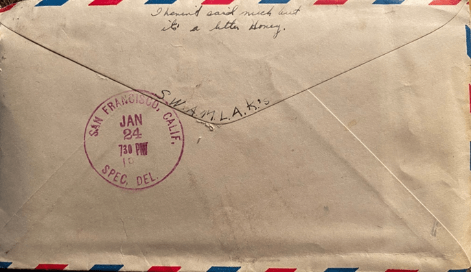 I sure do rate. I received 5 letters today, one special, two ordinary letters from you and two letters from the folks. I will answer them and go along. – We could put the top down if your Mother says we could. You said ‘Timmie’ or our little girl. We ought to think of the name for a girl, don’t you think so? I didn’t say nothing about the bond because I had already put the letter and envelope and I thought about leaving it in my room and didn’t sound so good, so I just slipped it into the envelope. Okay? Okay! I will send all of them to you. Yes, that $500 does sounds good. I guess enlisting in the Para Troopers was just a passing fancy. I get them every once in a while. (You know!) Even about enlisting in the Navy, I don’t know. I think I will try to stay right where I’m as long as I can.