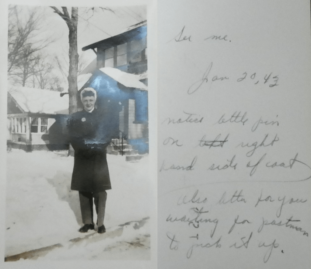 Well, here I am again home from work and no letter again, it’s the fourth day this week and I’m getting kind of disgusted. When I came in the door and saw no letter in its usual place I was mad. But then I got to thinking, he must be ill or it’s the mail or he didn’t write Tuesday night and when I think maybe you didn’t write it makes me a little mad, then I think maybe you’re ill, I usually worry, so you see I’m between the devil and the deep blue sea.