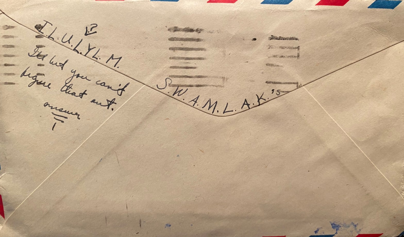 I wish to God that I could put into words the way I feel. All I can say, I guess, is that right now I feel like hell. I have your picture right in front of me and all I’m able to do this just sit here and look at it. I can’t reach out and take you by the hands and tell you how much I love you, I can’t hold you in my arms and kiss you. It is a very terrible feeling. I wish I could ask you to just chuck everything and come out here, but I can’t. I guess I love you too much, or I would ask you if I loved you as much is I think I do?