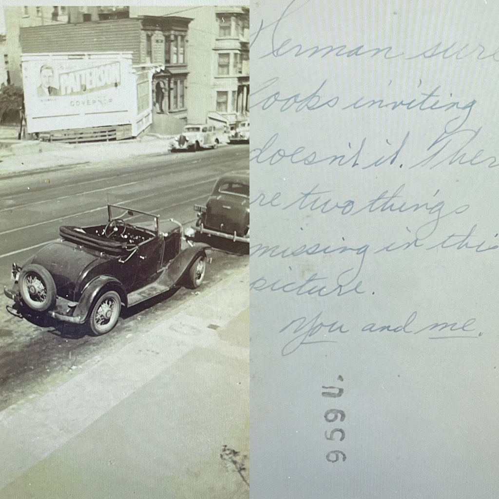 Well Honey, dinner is ready, so will close. Have you started to work yet? If so, how do you like it and how do you like Frisco? And been away from home? Honey, they are playing our piece “Who Wouldn’t Love You”. (Kay Kyser & His Orchestra – Who Wouldn’t Love You? https://www.youtube.com/watch?v=1POQ7jjLkmk ) I miss you so, honest I do. Write me as often as you can, please do. That hollowness is still with me and how I would like to feel your arms just once more. I will write again tomorrow.