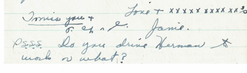 I just arrived home from horseback riding, had lots of fun. We stopped at this steakhouse for breakfast. But oh how I wish it had had of been with you instead of the girls. I had quite a time. My horse’s name was Mickey and was he ever unruly. Eleanor’s horse wouldn’t come down the path, so I went back after her. Then Mickey decided he didn’t want to go down the path no matter what I did, then all of a sudden he reared up, way up Honey, real high and I was skeared, so I decided to take him back and get another and then I saw a boy walking up the path and asked him what was wrong, he said that my horse had just thrown him and had come running for home (you see that was just a minute before I got there to the riding stable I mean). I thought the horse seemed awfully winded, so I went back and got another horse. I’m still kind of shaky.