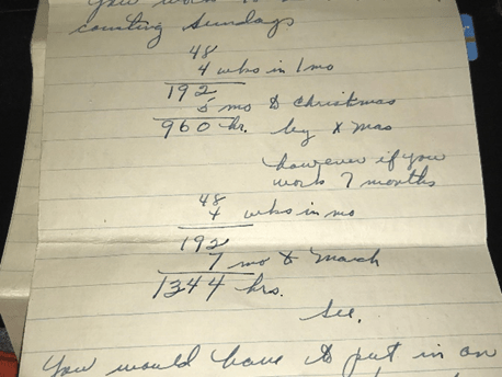 P.S.S. I don’t see how you could possibly get in 1200 hours by December. You work 48 hours a week not counting Sundays. 48 x 4 wks. in 1 month = 192 x 5 months to Christmas = 960 hrs. by Christmas. However, if you work 7 months, 48 x 4 wks. in months = 192 x 7 month to March = 1344 hours. See?
