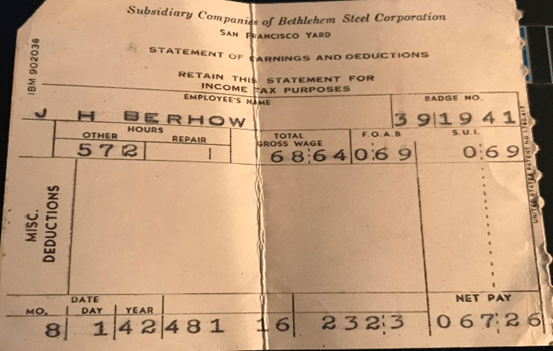 Johnny) Harlan’s pay stub 8/1/1942