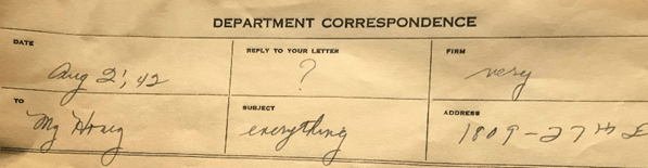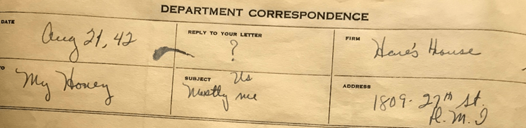 Honey, you are the most wonderful thing that ever happened to me and when I think of not seeing you for a whole year, it hurts, way down in the pit of my stomach. It hurts bad. I miss you just as bad as you miss me, even though I have my friends and folks here with me. But they never take the place of your arms, lips and person. I miss seeing Herman coming down the street and I missed going to Fisher’s and then to Union Park.
