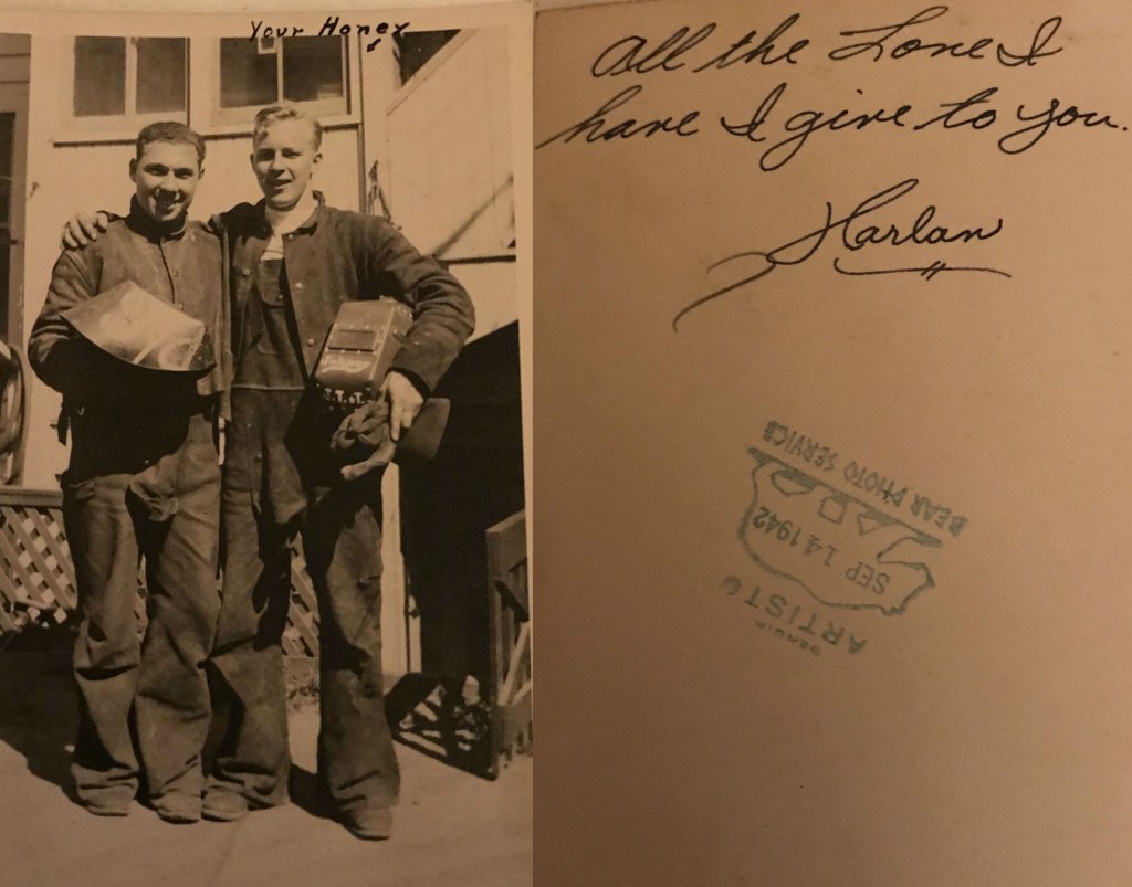 Syd and I got up this morning about 10 and took some pictures of ourselves in our welding equipment. Then we went out to the beach until about 3:30, came home and had dinner. We then cleaned up and went to see a show. Abbott and Castello ‘Pardon My Sarong’ and a Sherlock Holmes adventure. After we went to the show we came home and had supper. About your letter I received, that I have told you about. We then went out to the Shipyard Hospital and the doctor took my bandage off. We then went to a dance at El Patio. I danced quite a few dances and had a swell time. After the dance, we came home, and I am writing you a letter. I also have a letter to write to the folks and one to Opal. After that, I’m going to bed and will mail them all in the morning. I will mail this one Special Delivery, so you won’t have to wait until Tuesday night.